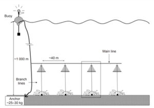 The net sleeve is a buoyant “umbrella” which sits on a vertical hook line above the baited hooks. The sleeve is able to slide up and down this line, but due to its positive buoyancy, it remains at the top of the vertical line whilst the baited hooks sit on the seabed. Once the gear is being hauled aboard, the movement of the vertical lines through the water causes the net sleeve to slide down and cover the hooks, shrouding any caught fish. As the gear is being retrieved, the catch (and sharp hook) is shielded from depredation.